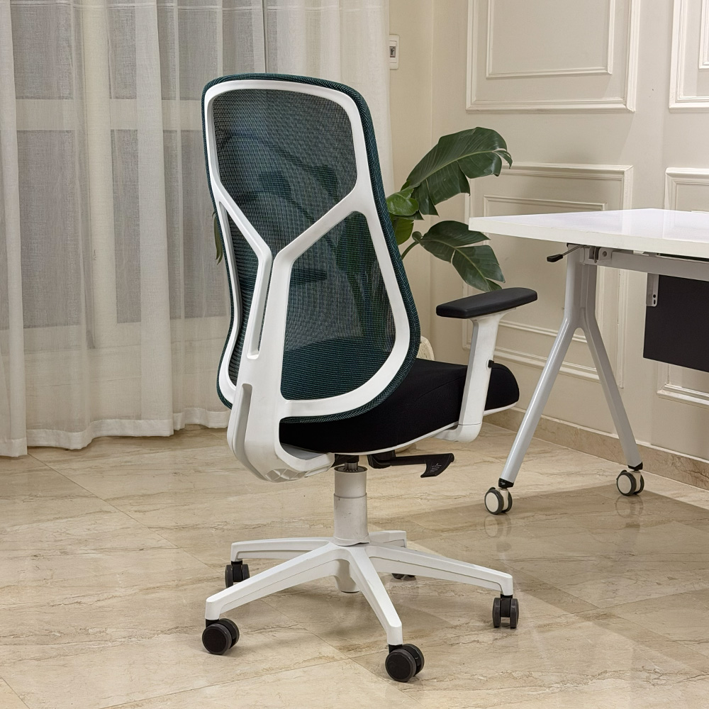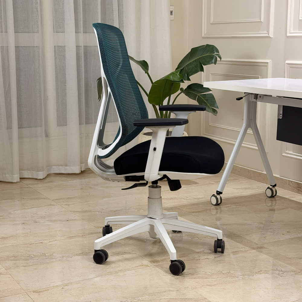 كرسي فينوس بشاسية ابيض وقماش أسود بتصميم مميز يدعم الفقرات القطنية مع ظهر شبك متحرك ( شازلونج ) قابل للتعديل والتثبيت لضمان مستوى اعلى من الراحه.
