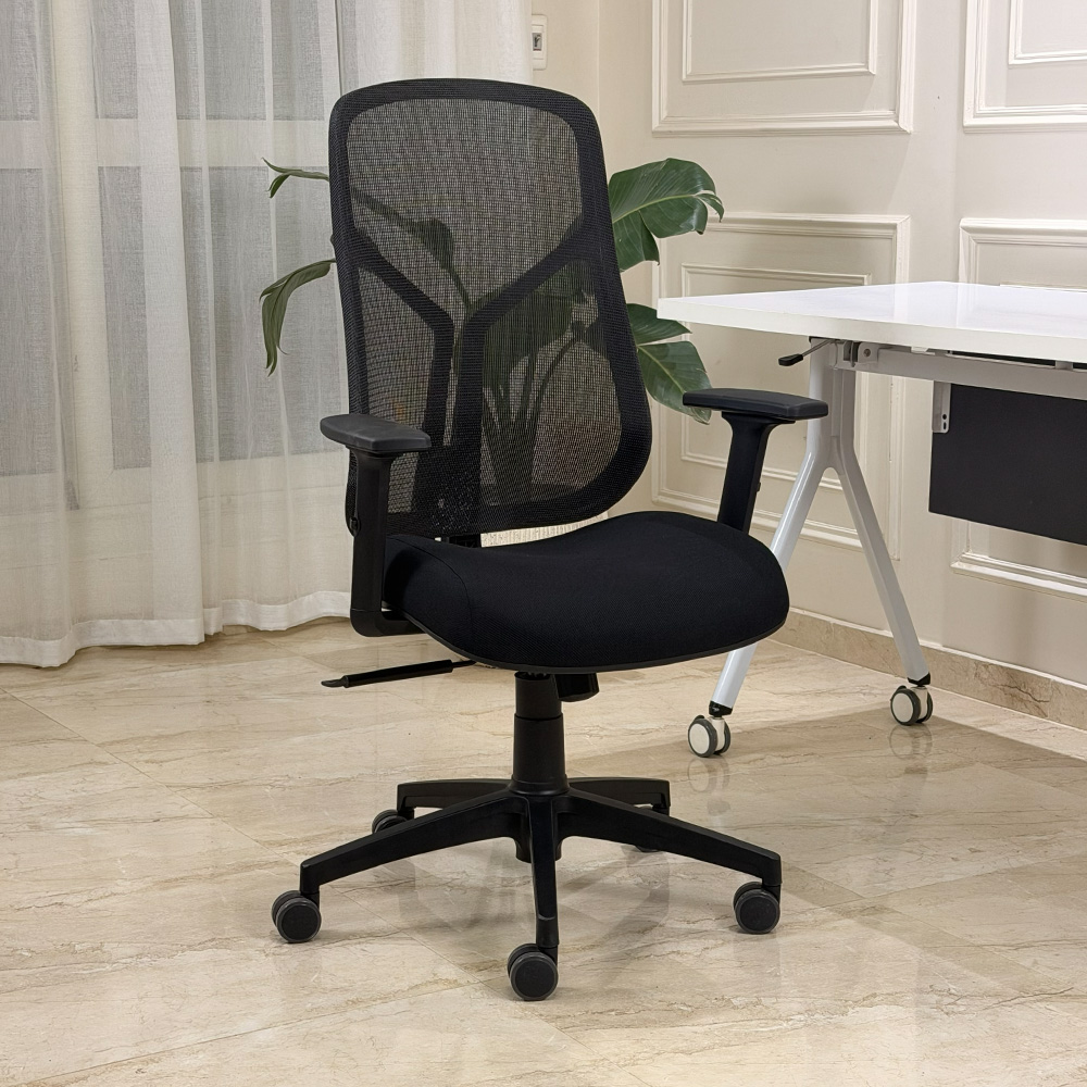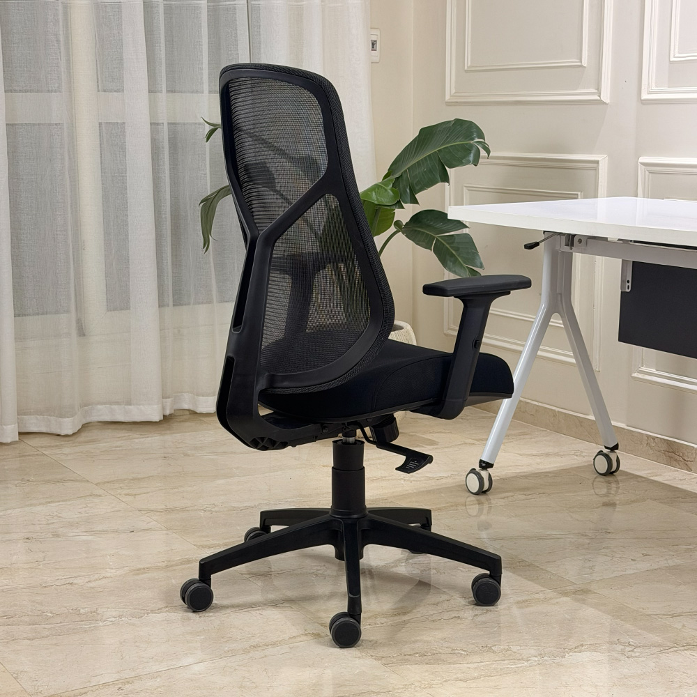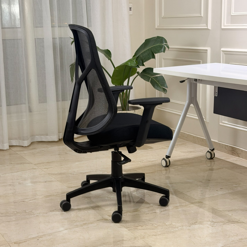 كرسي فينوس بشاسية أسود وقماش أسود بتصميم مميز يدعم الفقرات القطنية مع ظهر شبك متحرك ( شازلونج ) قابل للتعديل والتثبيت لضمان مستوى اعلى من الراحه.